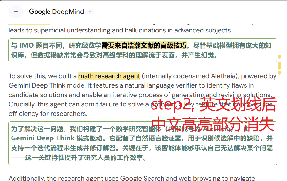 对英文部分划线后,好像会对划线的文本再次进行翻译,导致原来翻译中文的划线瞬间消失