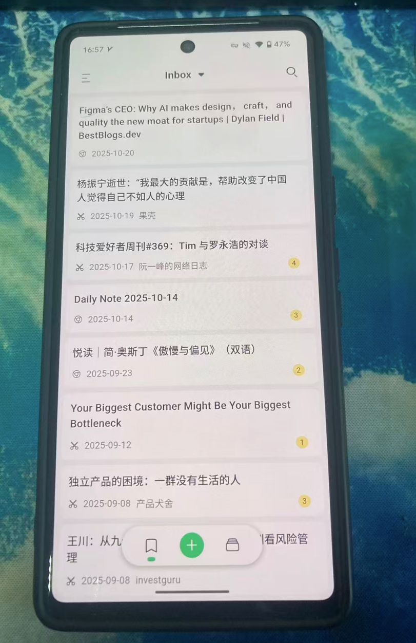 支持阅读剪藏的文章,可以浏览划线,和写Daily