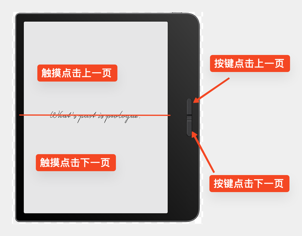 常见墨水屏举例,6 寸墨水屏一般不带侧边翻页键,7 寸以上都带侧面翻页键(实际上就是执行↑,↓操作)